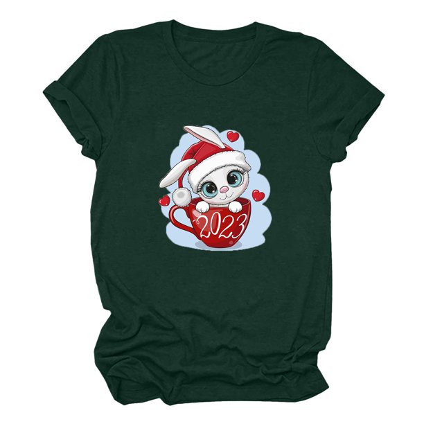 Zodggu Rollback Loose Casual Fashion Ladies Blouse Tops Happy New Year 2023 Print Cute Bunny Print Short Sleeve Crew Neck Funny Pattern Large Size T Shirts For Women Female Leisure Green 12